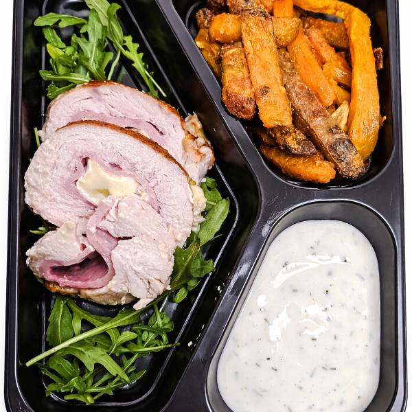 Krutí roládky s hermelínem a šunkou, zeleninové hranolky, dip